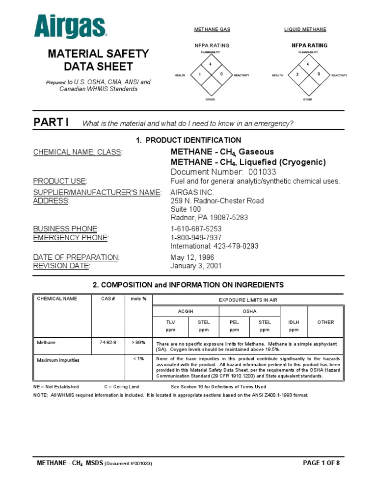 CHEMICAL NAME CAS # mole % EXPOSURE LIMITS IN AIR ACGIH OSHA TLV STEL PEL STEL IDLH OTHER ppm ppm ppm ppm ppm Methane 74-82-8 > 99% There are no specific exposure limits for Methane. Methane METHANE GAS LIQUID METHANE. METHANE - CH 4 MSDS (Document # 001033) PAGE 2 OF 8 3. ... Retrieve Here